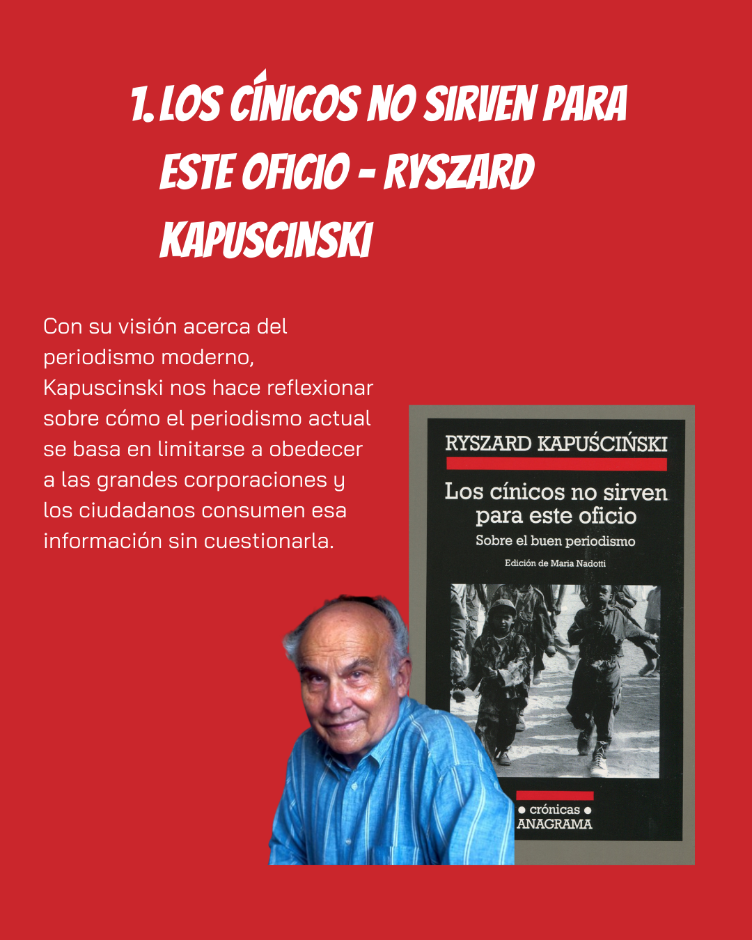 El periodista y escritor polaco nos dejó por escrito un libro que debería ser obligatorio para cualquier periodista que se digne a serlo. Con su visión acerca del periodismo moderno, Kapuscinski nos hace reflexionar sobre cómo el periodismo actual se basa en limitarse a obedecer a las grandes corporaciones y los ciudadanos consumen esa información sin cuestionarla. Además, nos deja una reflexión clave: Hay que ser buenos periodistas, pero, sobre todo, buenas personas.