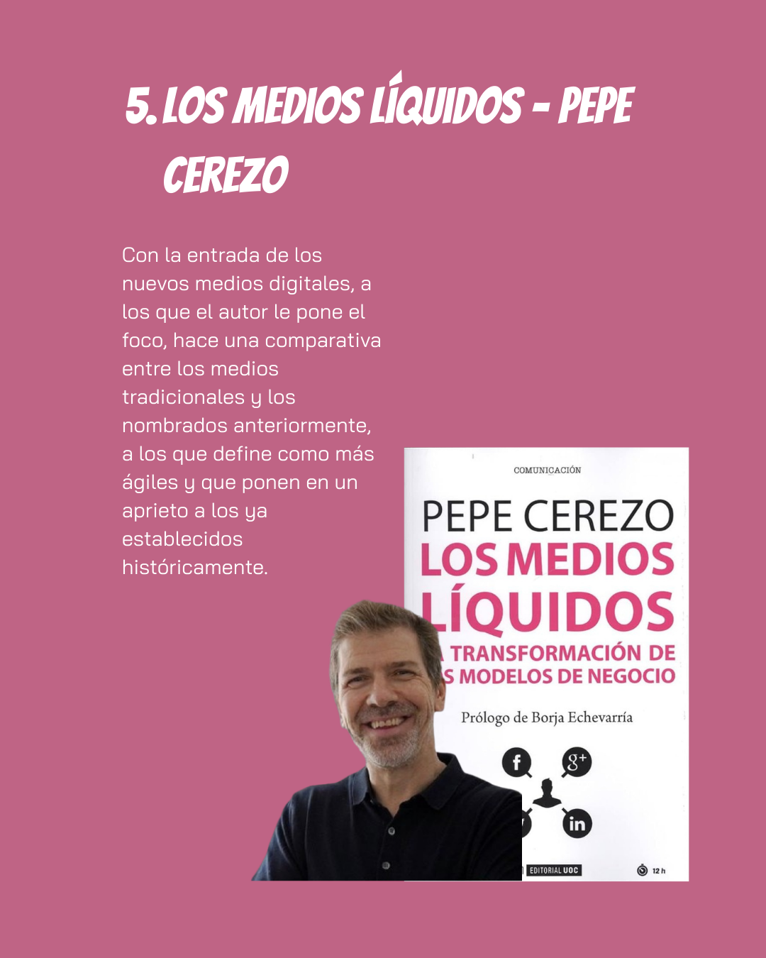 Si queremos hablar de los medios y su evolución, este libro de Pepe Cerezo es el ideal, ya que trata de la transformación de los medios y su cambio al mundo actual. Con la entrada de los nuevos medios digitales, en los que el autor pone el foco, hace una comparativa entre los medios tradicionales y los nombrados anteriormente, a los que define como más ágiles y los cuales ponen en un aprieto a los ya establecidos históricamente.