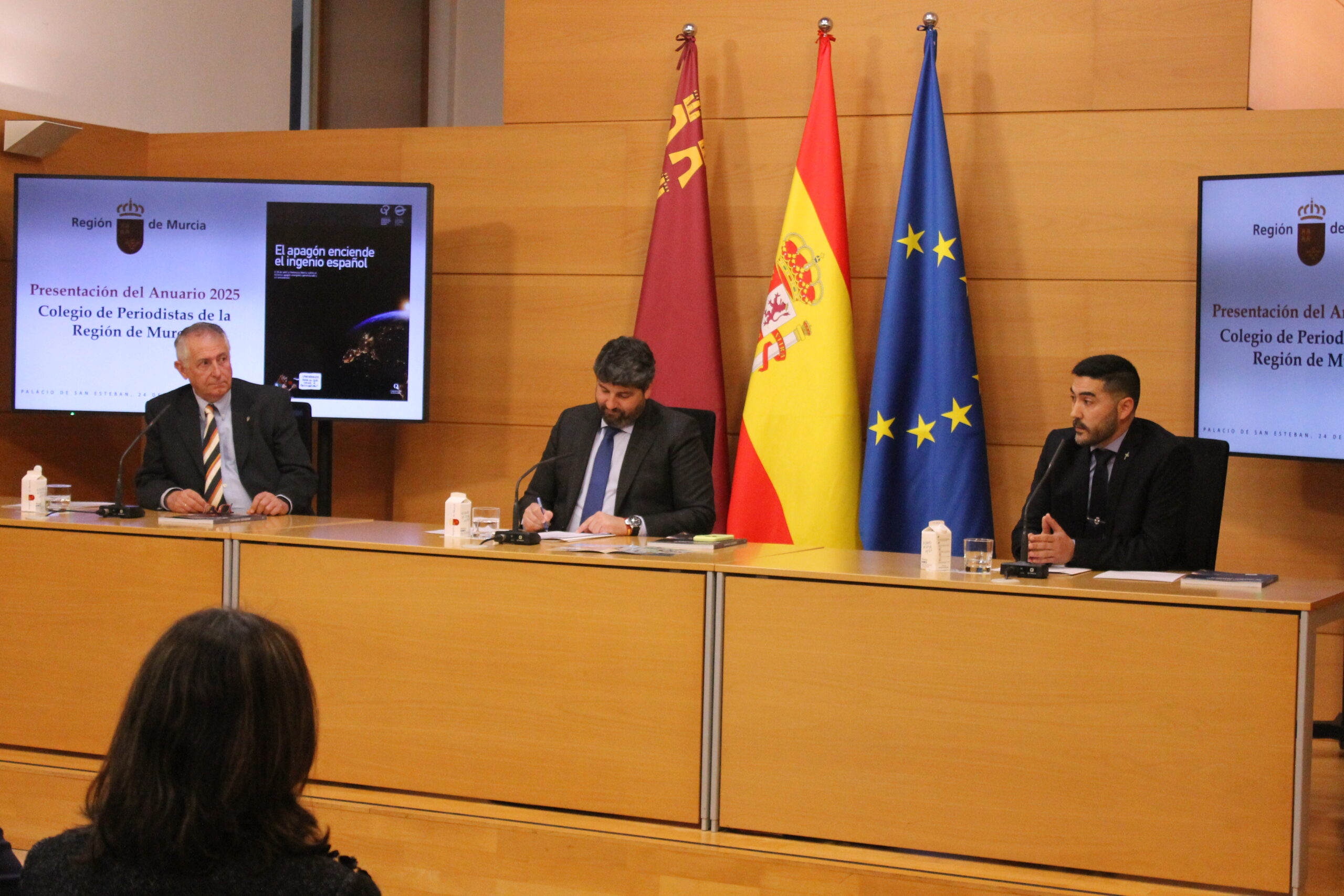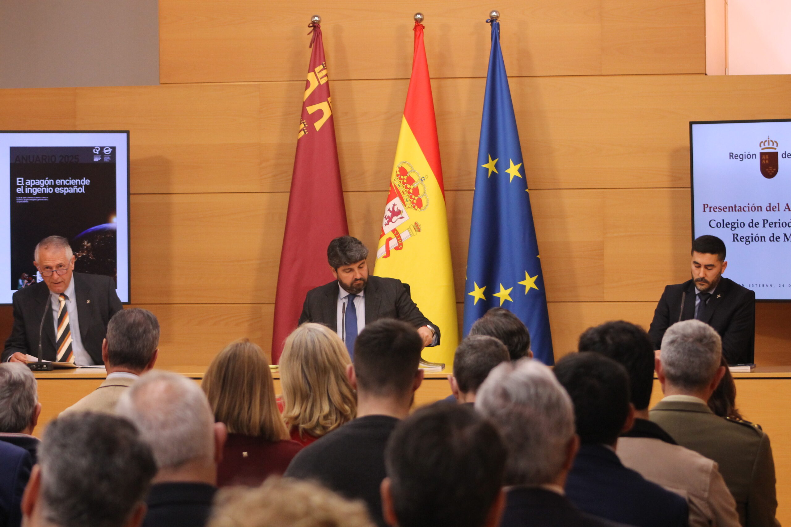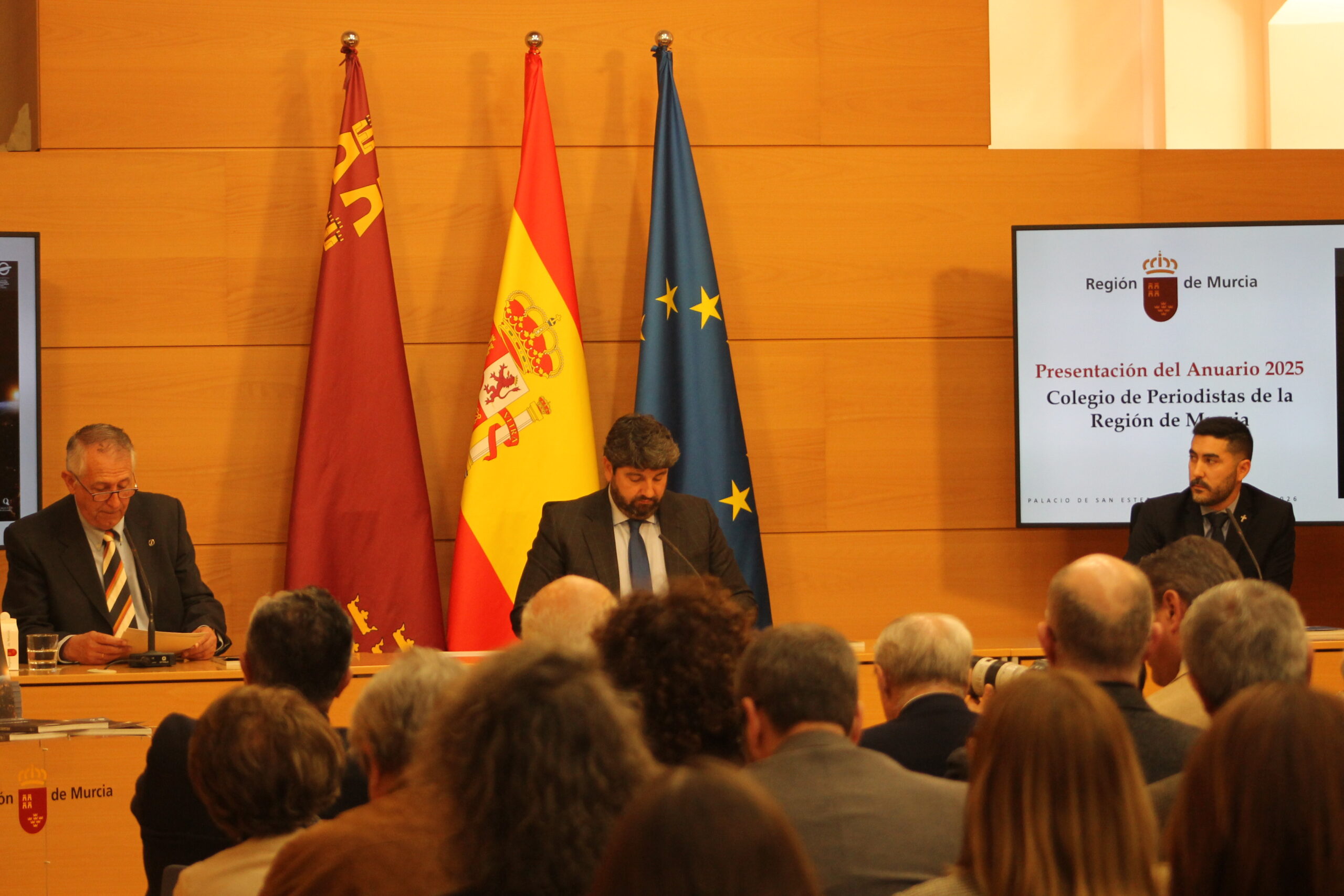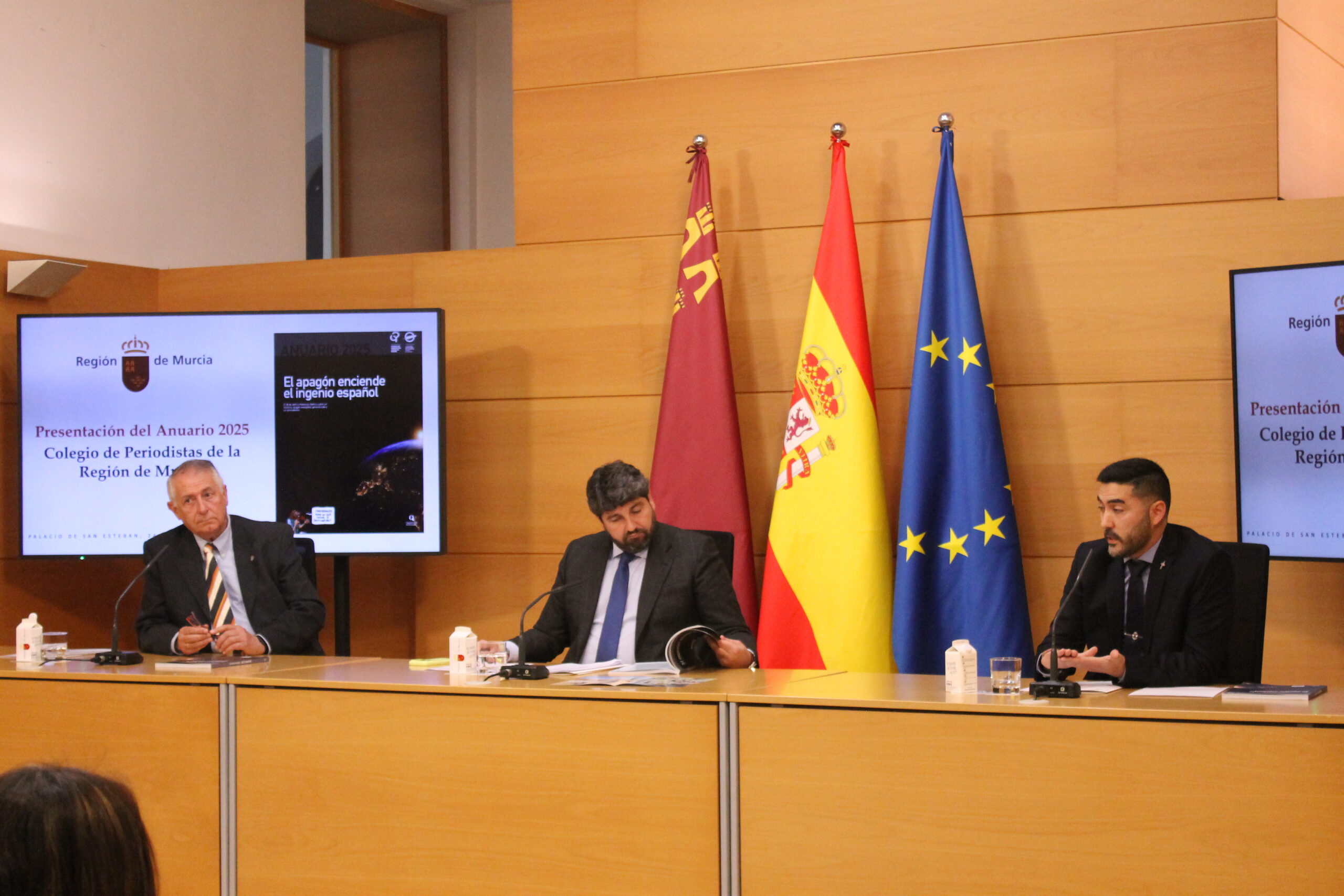 El Colegio Oficial de Periodistas ha presentado este martes el Anuario de la Región de Murcia 2025 en el Palacio de San Esteban, bajo la presidencia de Fernando López Miras, presidente de la Comunidad Autónoma de la Región de Murcia (CARM), y con la asistencia de diversas autoridades locales y regionales. Además del presidente del ejecutivo murciano, en la presentación han intervenido el decano del Colegio de Periodistas, Miguel Massotti Manzanares, y el director del Anuario, Ángel Blasco Lozano.