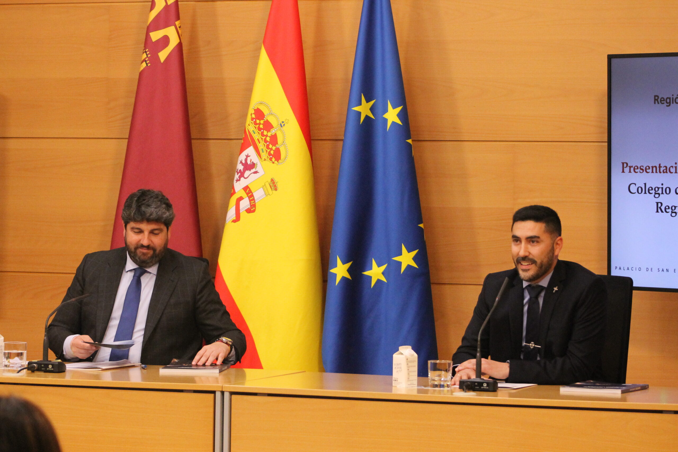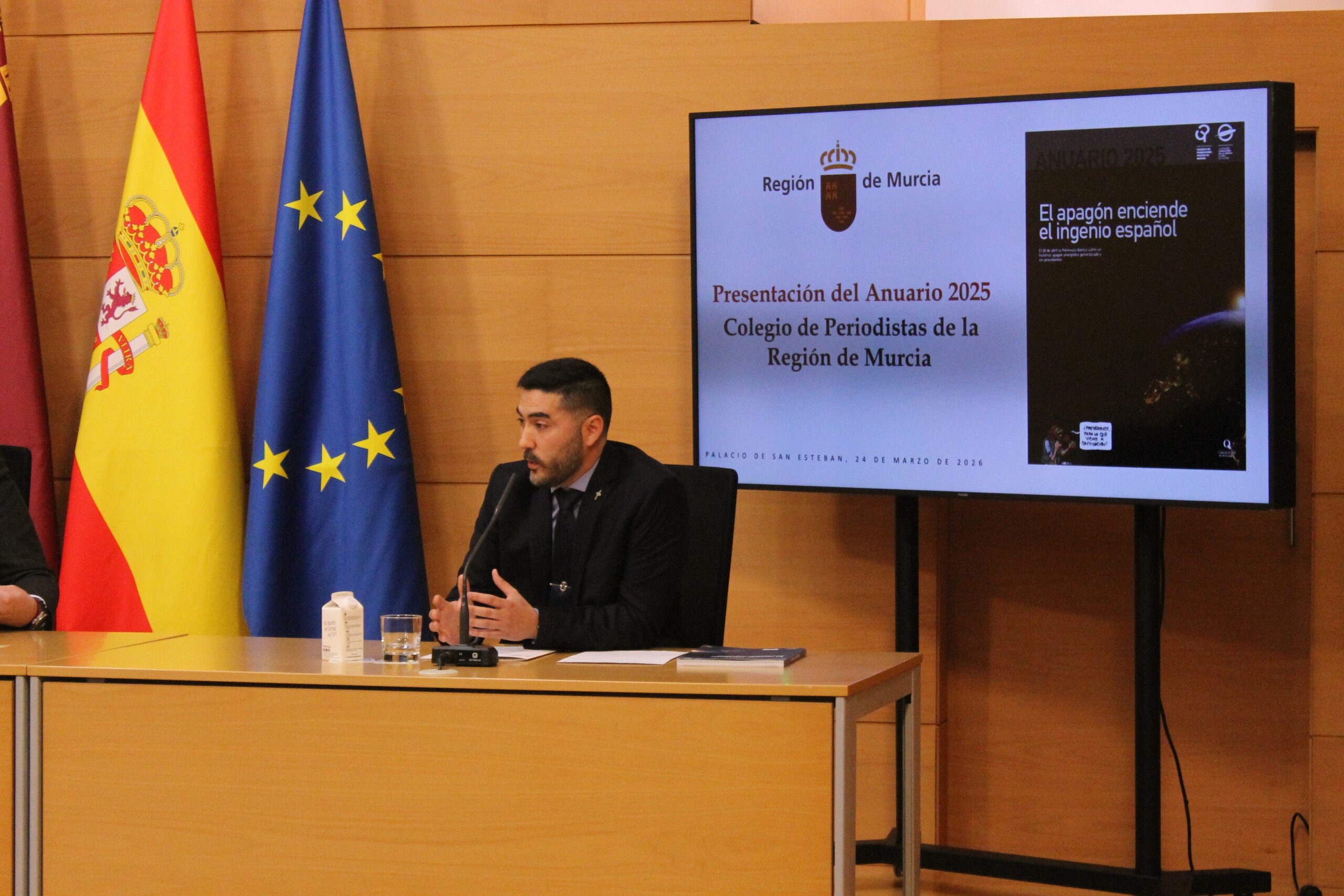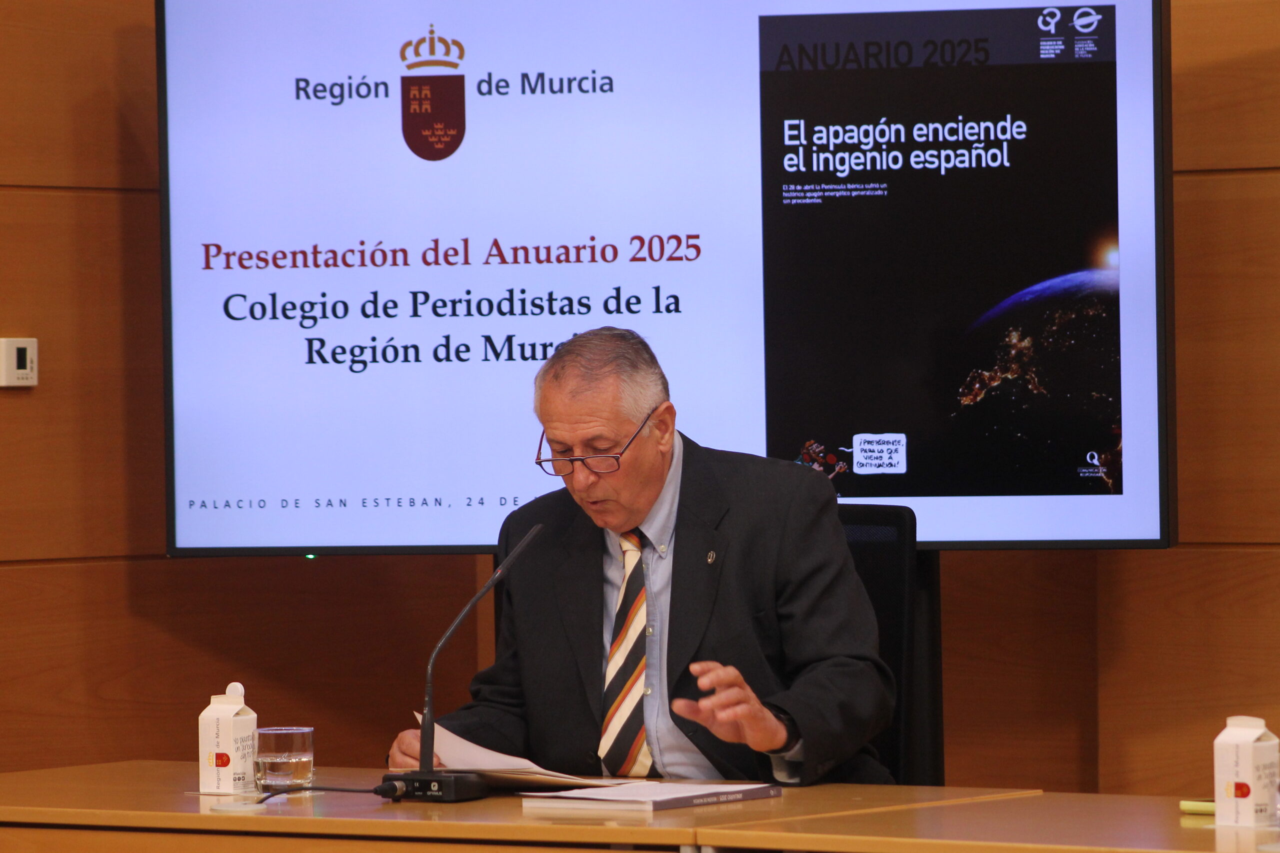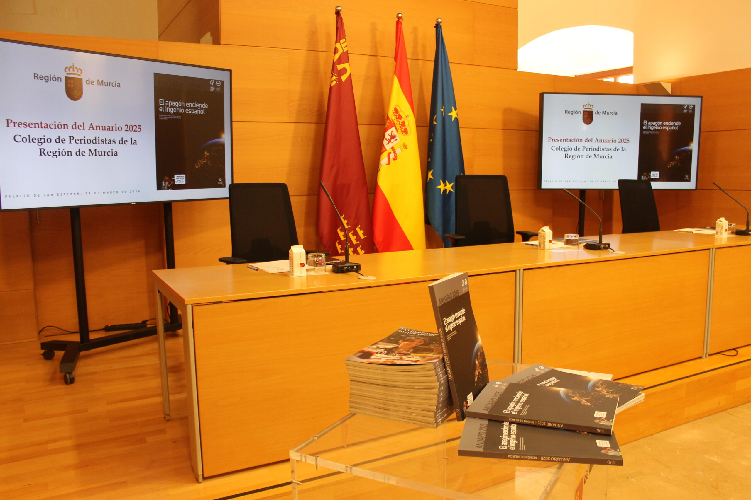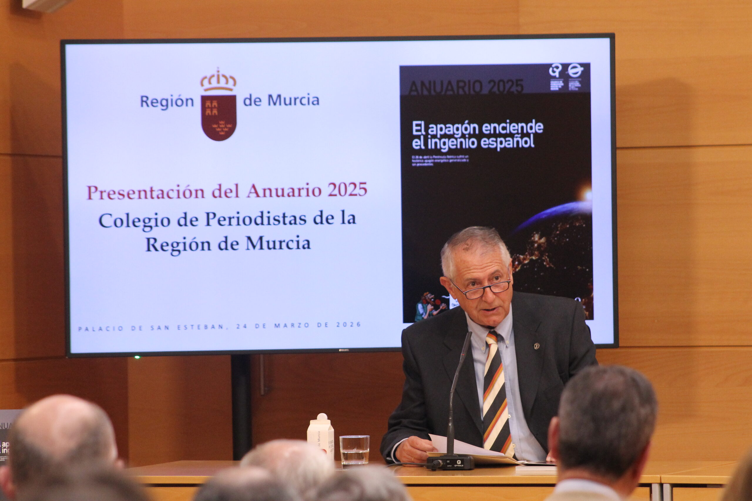El Colegio Oficial de Periodistas ha presentado este martes el Anuario de la Región de Murcia 2025 en el Palacio de San Esteban, bajo la presidencia de Fernando López Miras, presidente de la Comunidad Autónoma de la Región de Murcia (CARM), y con la asistencia de diversas autoridades locales y regionales. Además del presidente del ejecutivo murciano, en la presentación han intervenido el decano del Colegio de Periodistas, Miguel Massotti Manzanares, y el director del Anuario, Ángel Blasco Lozano.