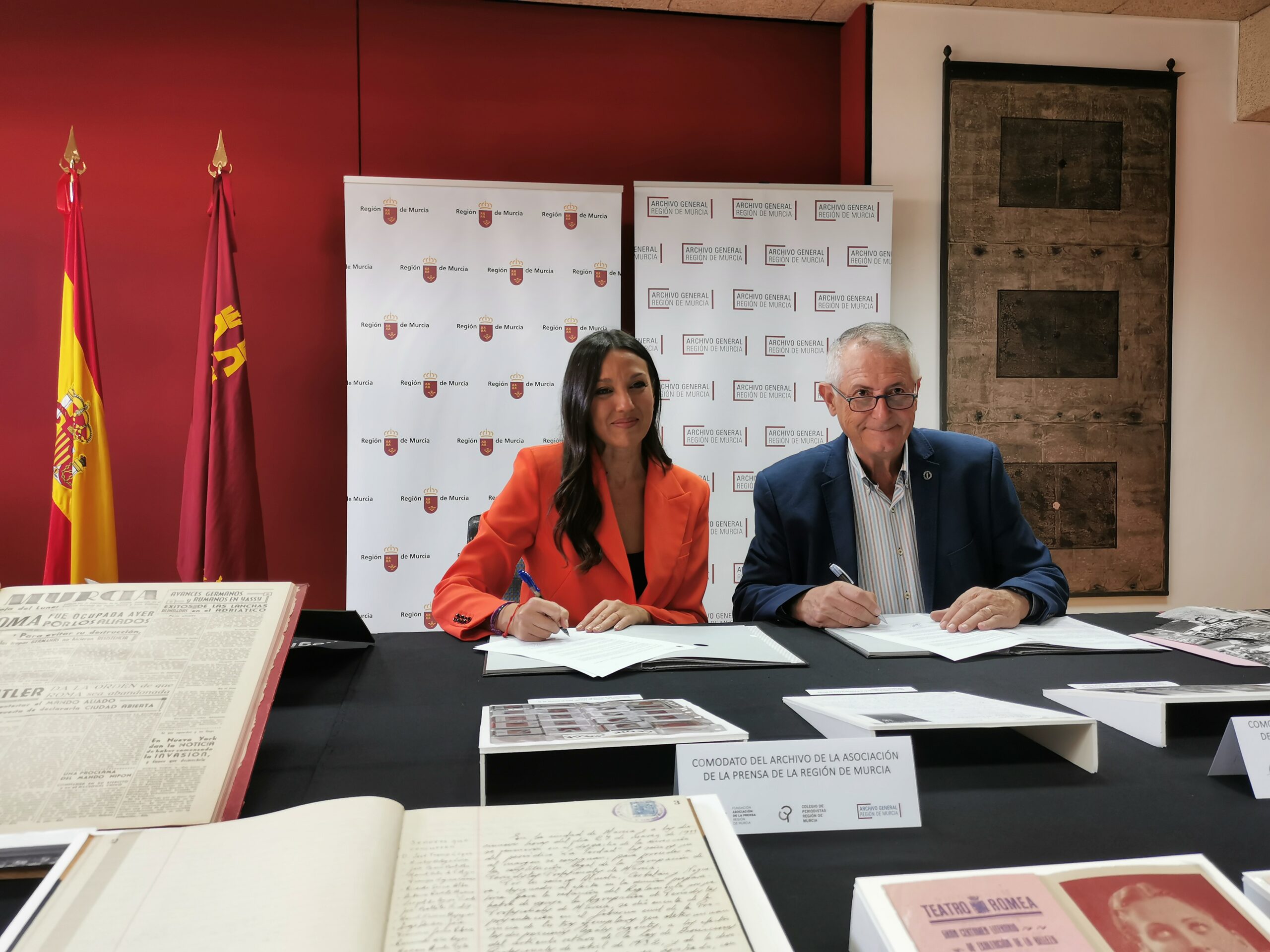 El Archivo General de la Región de Murcia custodiará el fondo documental de la Asociación de la Prensa. La consejera de Turismo, Cultura, Juventud y Deportes, Carmen Conesa, y el decano del Colegio de Periodistas de la Región de Murcia y presidente de la Fundación Asociación de la Prensa, Miguel Massotti, han firmado este viernes un acuerdo por el que el archivo histórico de la centenaria entidad periodística quedará depositado en el Archivo General para su conservación, organización, consulta y difusión entre toda la ciudadanía.