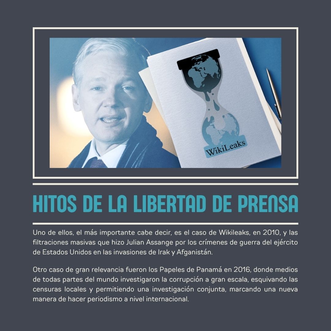 Pero no todo son malas noticias en el mundo periodístico actual. Durante este siglo se han vivido hitos que han marcado un antes y después en la libertad de prensa mundial. Uno de ellos, el más importante cabe decir, es el caso de Wikileaks, en 2010, y las filtraciones masivas que hizo Julian Assange por los crímenes de guerra del ejército de Estados Unidos en las invasiones de Irak y Afganistán. Este caso terminó con la encarcelación de su autor, pero supuso un punto de inflexión en el periodismo de investigación.